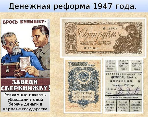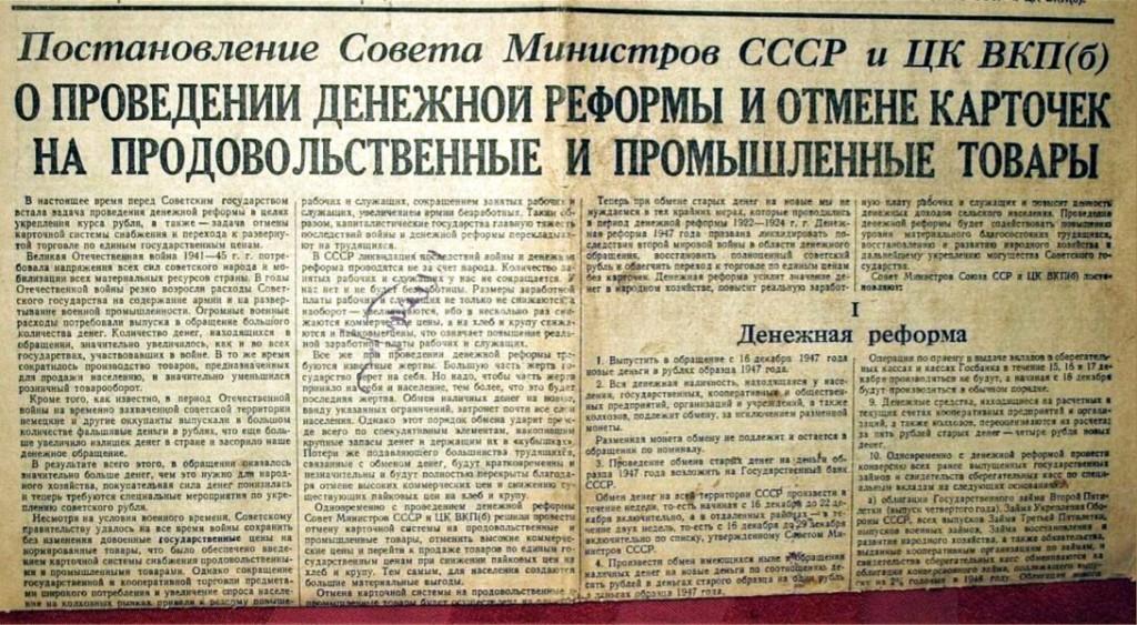 14 декабря 1947 года вышло Постановление Совета Министров СССР и ЦК ВКП(б) «О проведении денежной реформы и отмене карточек на продовольственные и промышленные товары». Согласно этому документу, все наличные деньги граждан и организаций должны были обмениваться на новые купюры образца 1947 года в соотношении 1:10.