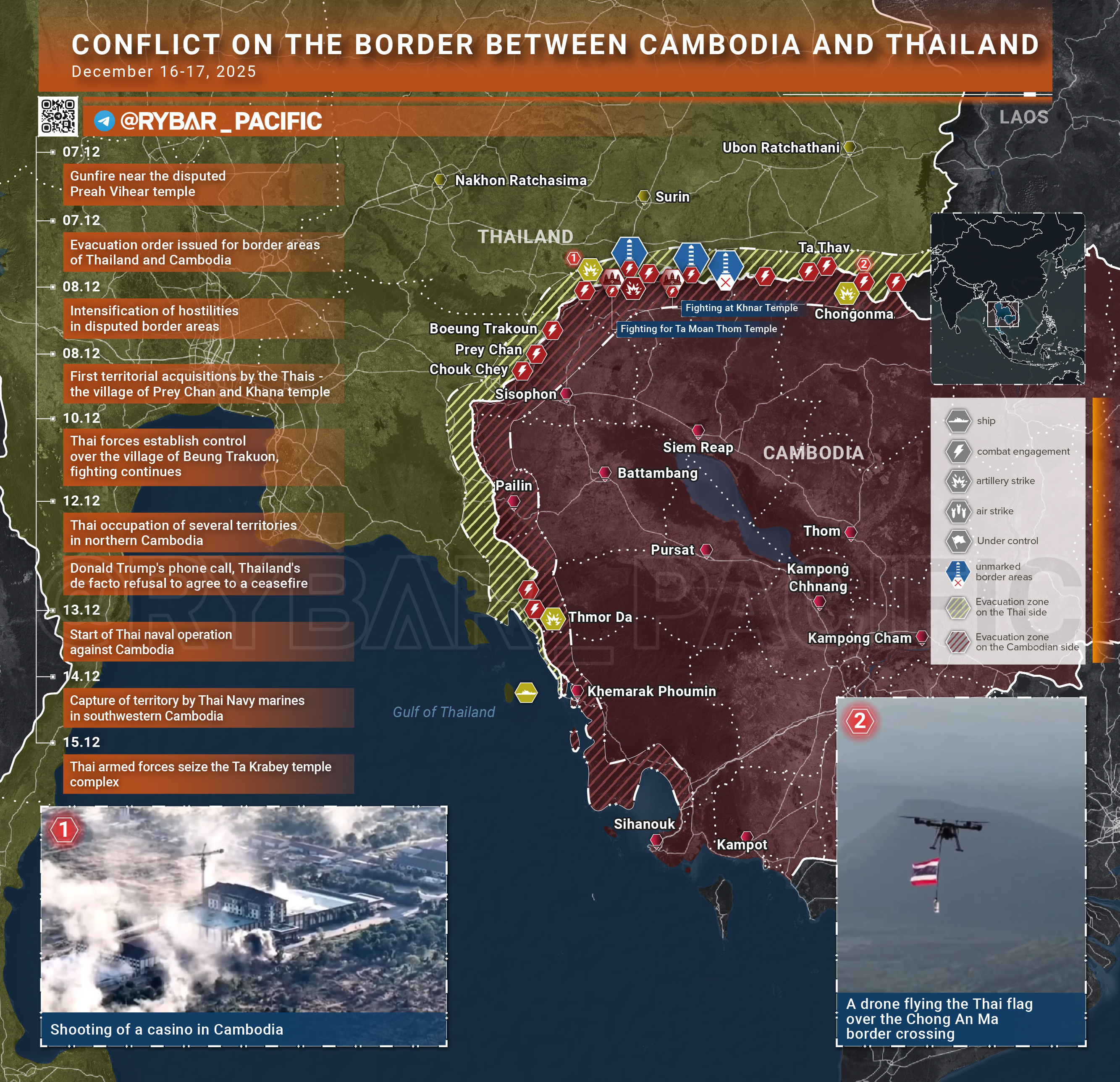 Как обстоят дела в приграничье?На севере Камбоджи тайцы и камбоджийцы ведут бои на все тех же участках, а именно возле спорных храмов, а также недемаркированных местах на границе. В ВС Таиланда отчитываются о полном захвате пограничного пункта Чонганма, но кадрами объективного контроля заявления тайцев не подтверждены.